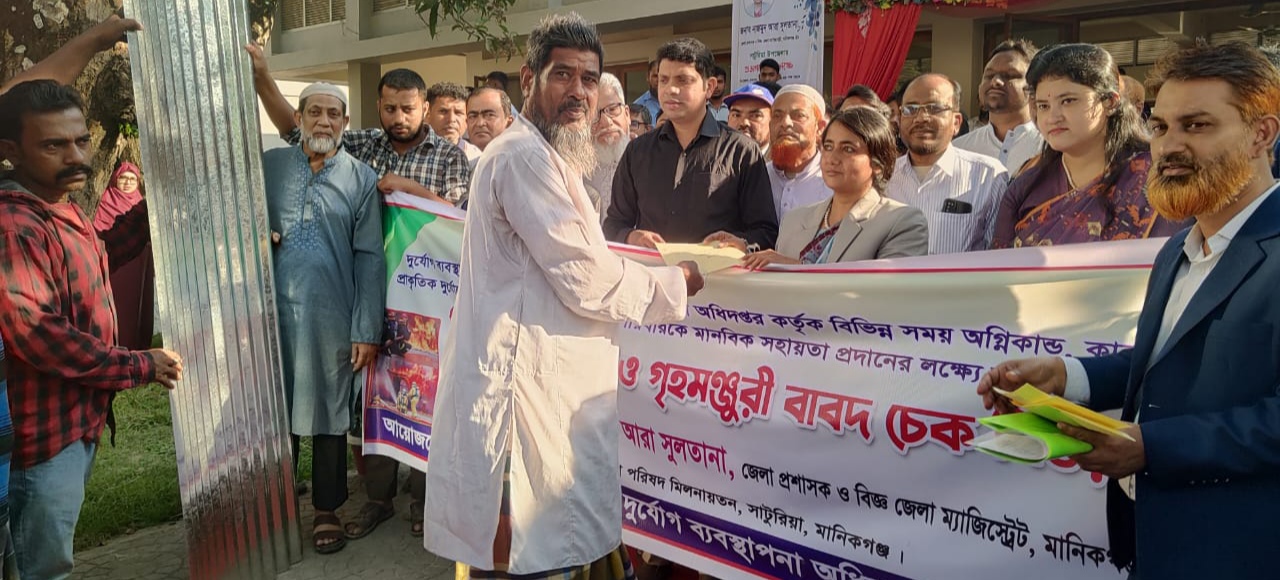 বৃহস্পতিবার দুপুরে উপজেলা চত্তরে আনুষ্ঠানিকভাবে টিন ও চেক বিতরণ করেন মানিকগঞ্জ জেলা প্রশাসক নাজমুন আরা সুলতানা।