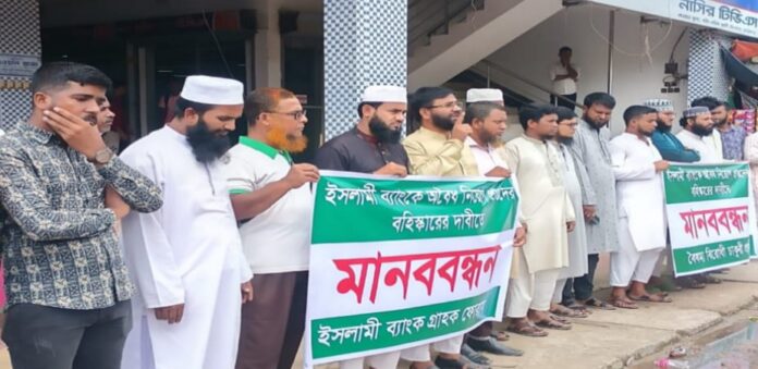 সোমবার (৬ অক্টোবর) সকাল সাড়ে ৯ টার দিকে ইসলামী ব্যাংকের গ্রাহক ফোরাম ও বৈষম্য বিরোধী চাকরি প্রার্থীরা মানববন্ধনে অংশ নেন।